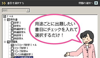 | パッケージされた書目データベースから,使用したい書目を追加する。改訂などの際は,ここで削除・追加・更新が可能。 | 追加した書目データベースの一覧から,テスト作成に必要な書目を選択する。教科書/問題集の組み合わせなどが可能。 |